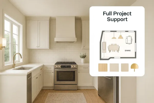 Comprehensive 3D design and full project support — layout, materials, lighting, and styling to bring your dream kitchen to life.